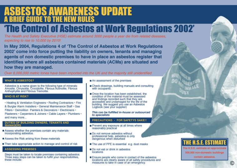 In May 2004, Regulations 4 of ‘The Control of Asbestos at Work Regulations 2002’ came into force. This puts the liability on owners,